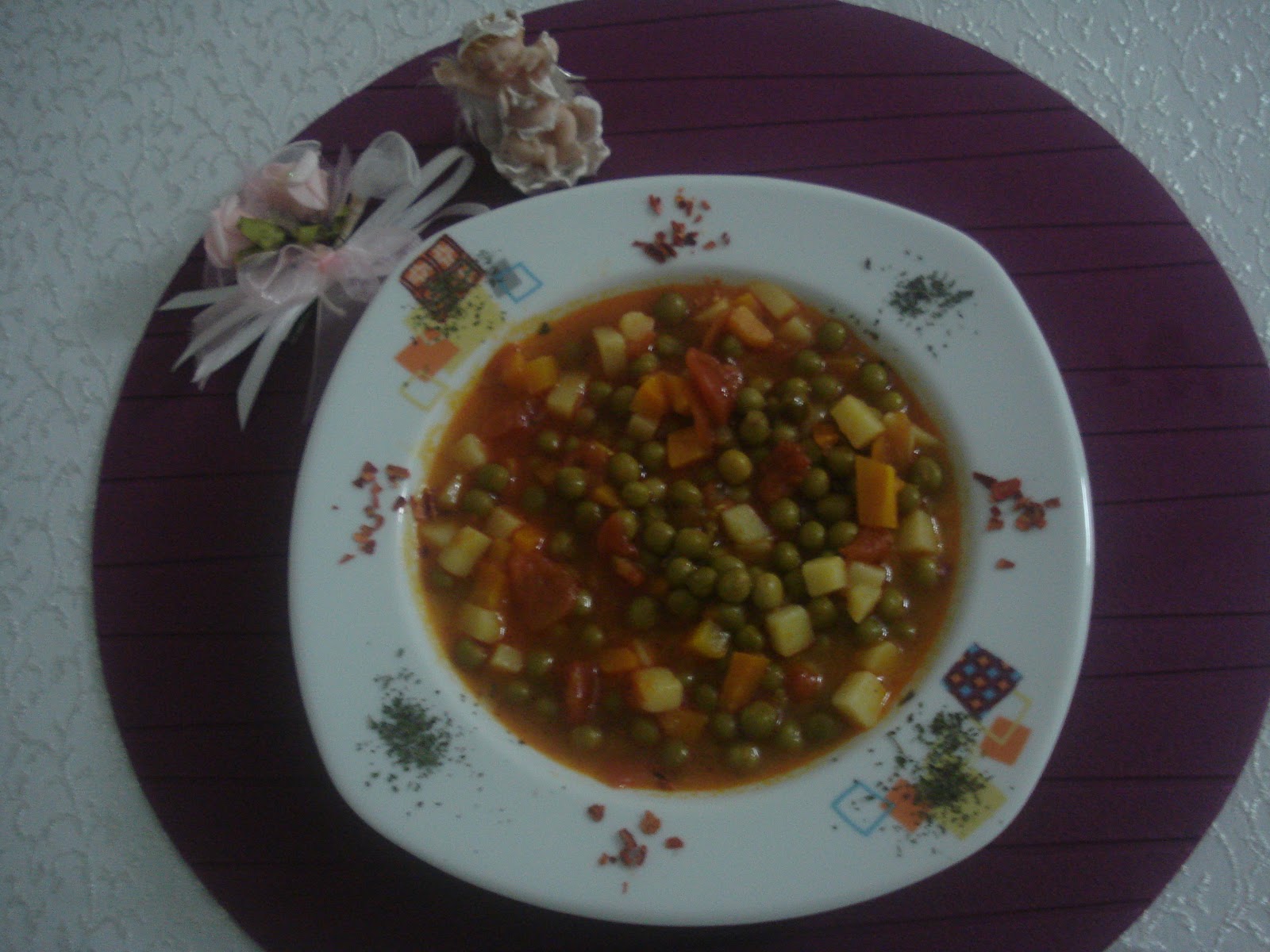 Soğanları küçük küçük doğrayıp pembeleşinceye kadar kavuralım, küp küp doğradığımız havuç ve patatesi atıp biraz daha kavuralım, domatesleri ve salçayı koyup 2-3 dakika pişirelim. Bezelyeleri ve tuzu ekleyip malzemelerin üzerinde görünecek kadar su ekleyip havuçlar pişene kadar pişirelim…