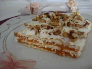 Balkabağını 2 su bardağı şekerle iyice pişirelim.Şerbetini süzüp balkabağını ezelim. Dikdörtgen borcam tepsiye bisküvileri bir kat dizelim, üzerine balkabağının yarısını çatal yardımı ile dağıtalım. Üzerini bisküvi ile kapatıp kalan kabağı yine çatal yardımı ile yayıp üzerini bisküvi ile kapatalım.