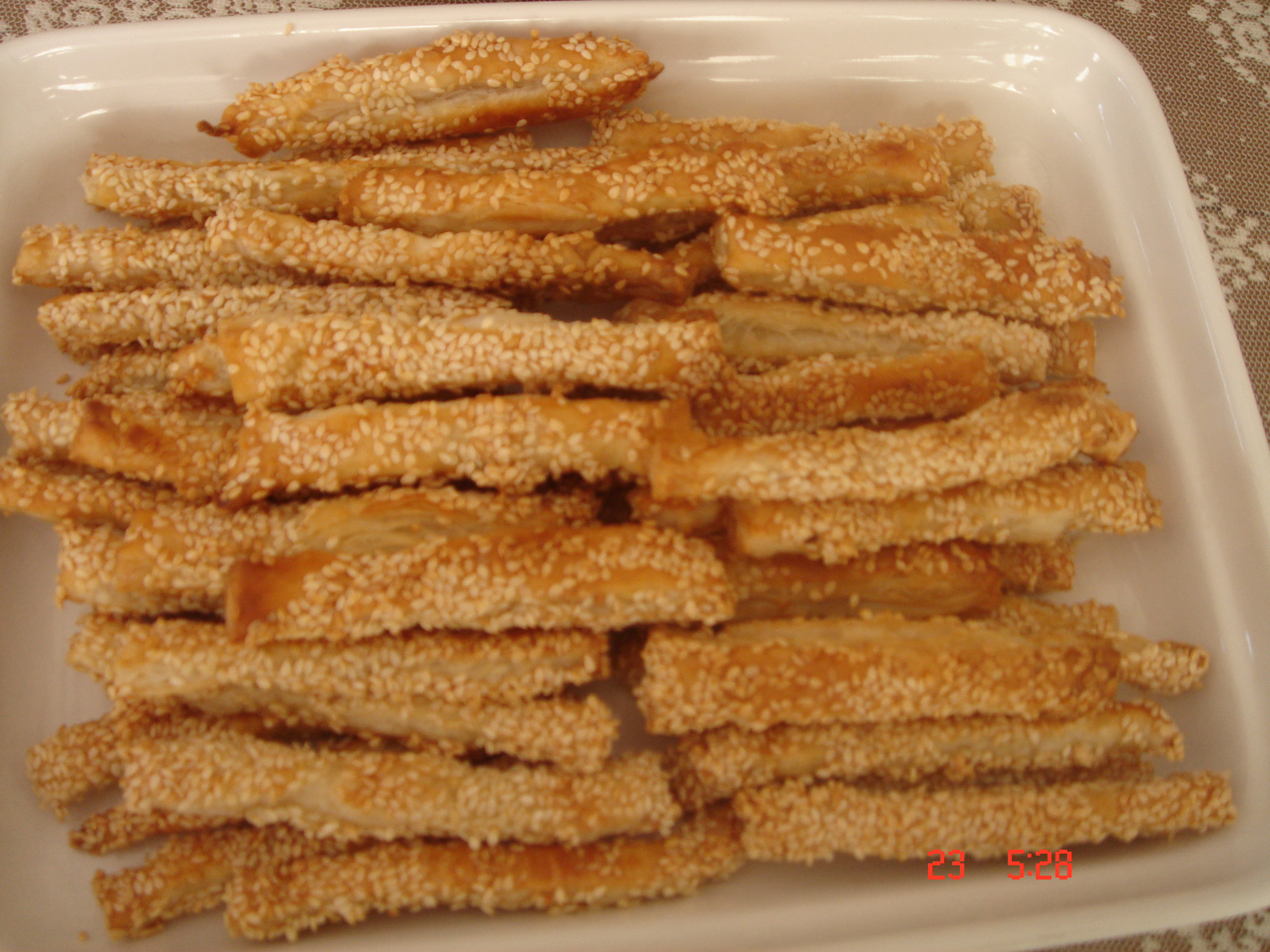 Buzluktan çıkardığımız miföy hamurlarını çok yumuşatmadan bir bıçak yardımı ile her birini uzunlamasına 7 parçaya bölüyoruz. Önce yumurta akına sonra susama bulayıp yağlı kağıt serdiğimiz fırın tepsisine diziyoruz. 200 derecelik fırında kızarıncaya kadar pişiriyoruz. Afiyet olsun 🙂