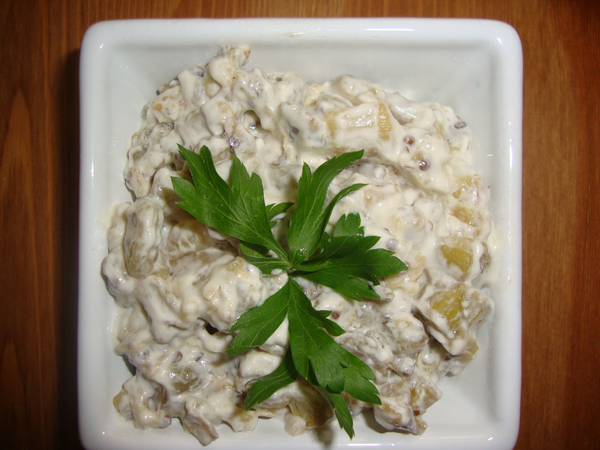 Patlıcanlarımızı soyup küçük küpler halinde doğradıktan sonra 10 – 15 dk tuzlu suda bekletiyoruz. Sıvı yağımızı tavada kızdırdıktan sonra tuzlu suda olan patlıcanlarımızı süzerek tavaya alıyoruz. Patlıcanlarımız kızarırken tuzu ilave ediyoruz ve kızarma işlemi bittikten sonra patlıcanlarımızı soğumaya bırakıyoruz. Patlıcanlarımız soğuduktan sonra yoğurt ve mayonezle karıştırıp servis tabağına alıyoruz. Afiyet olsun.