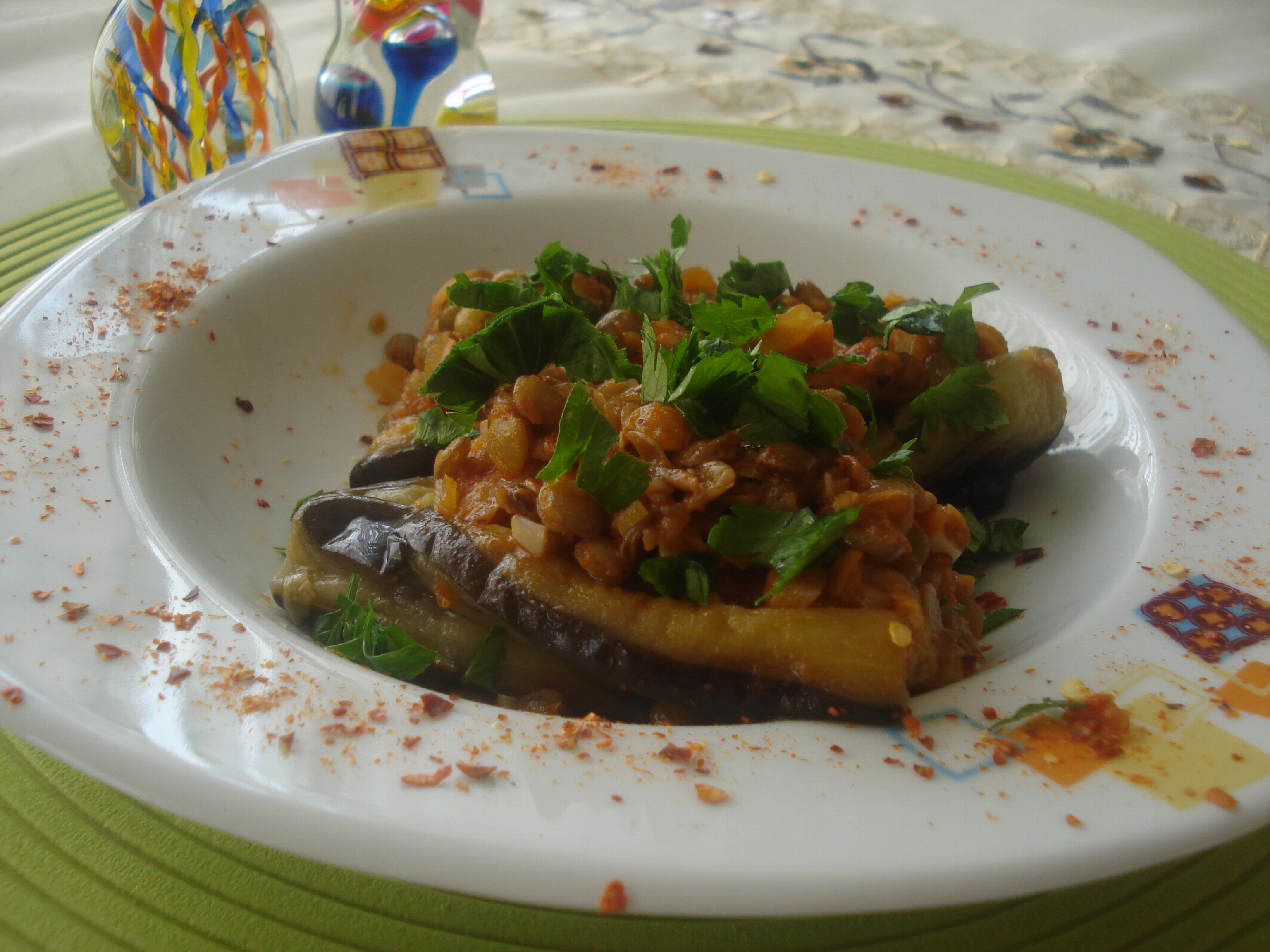 Yeşil mercimekleri haşlayalım. Soğanları yemeklik doğrayıp 2 yemek kaşığı zeytinyağı ile kavuralım üzerine salça, tuz, karabiber, doğradığımız domatesleri ve sarımsağı ekleyip 10 dak kadar pişirip haşlanmış mercimekleri ekleyelim. Hazırladığımız harcı patlıcan dilimlerinin arasına ve üzerine paylaştıralım. 1 su bardağı ılık su koyup 20-25 dak. pişirelim.